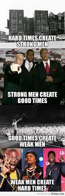 Hard times create strong men. The good times created weak men otherwise known as group of people i disagree with. Good times create weak men. Please comment & share if you like it! Save and share your meme collection!